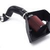 The inlet elbow is made from a lightweight aluminum tube with CNC machined connections and a laser-cut bracket is fully TIG welded and powder-coated in a mottled black finish for an OEM look.