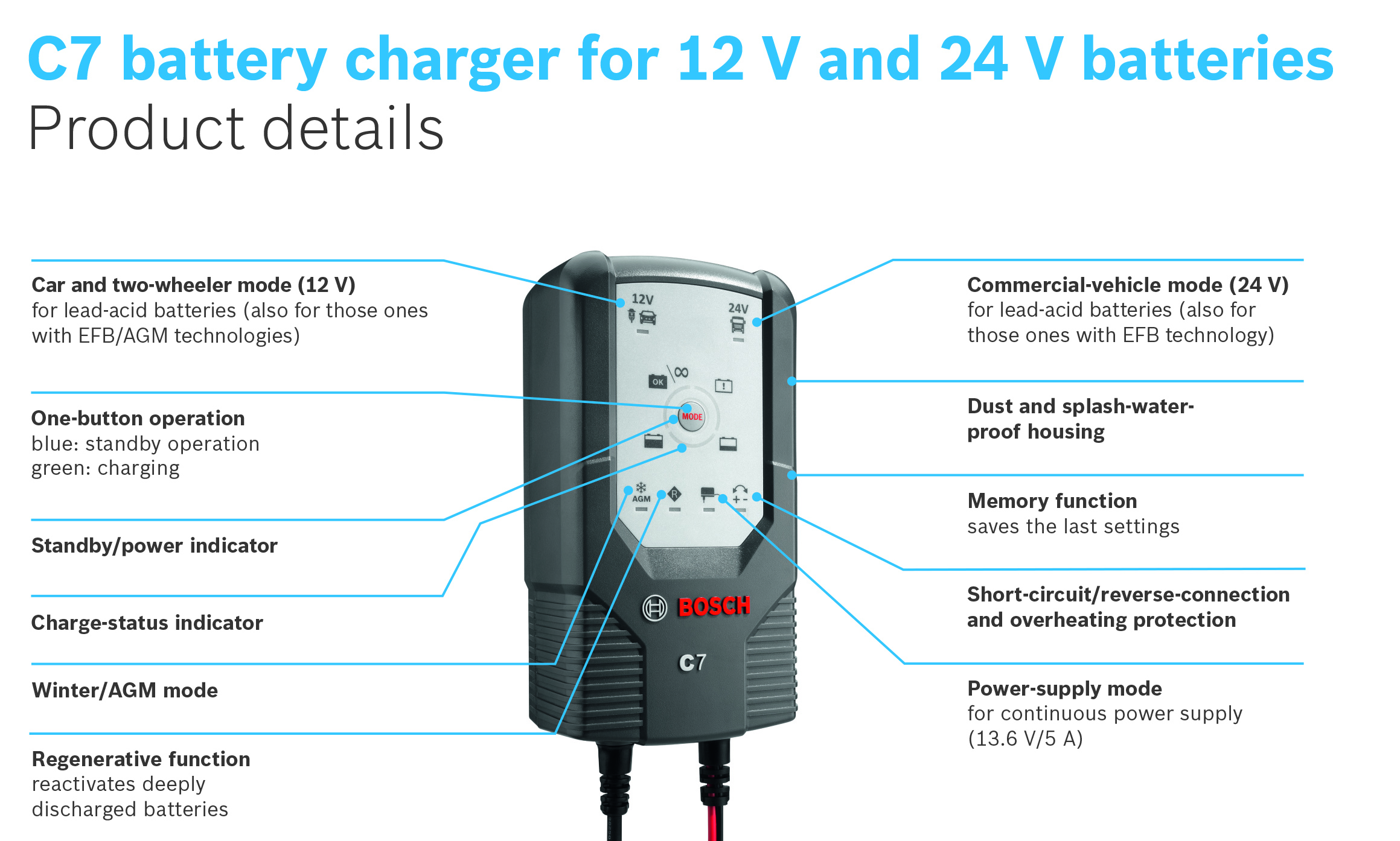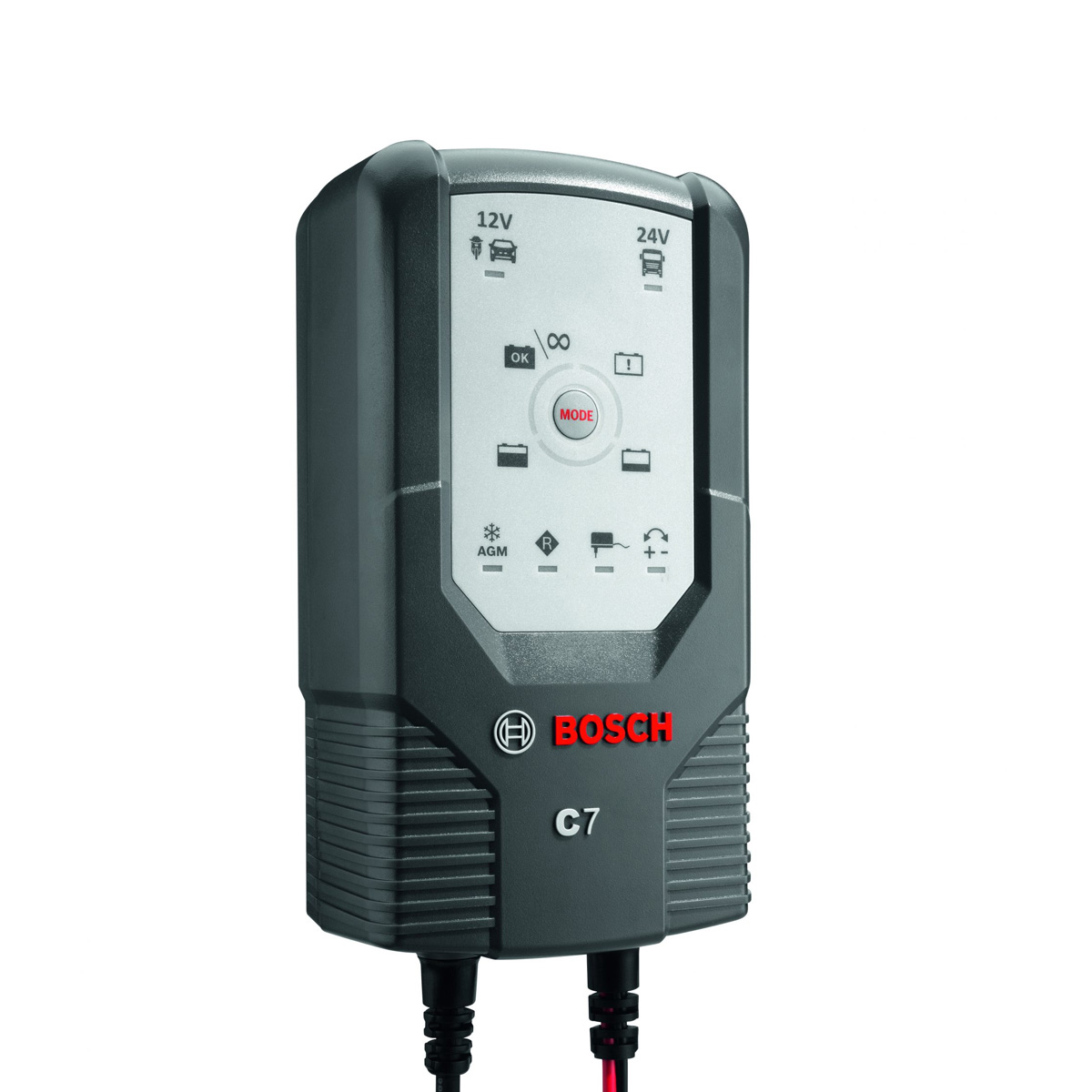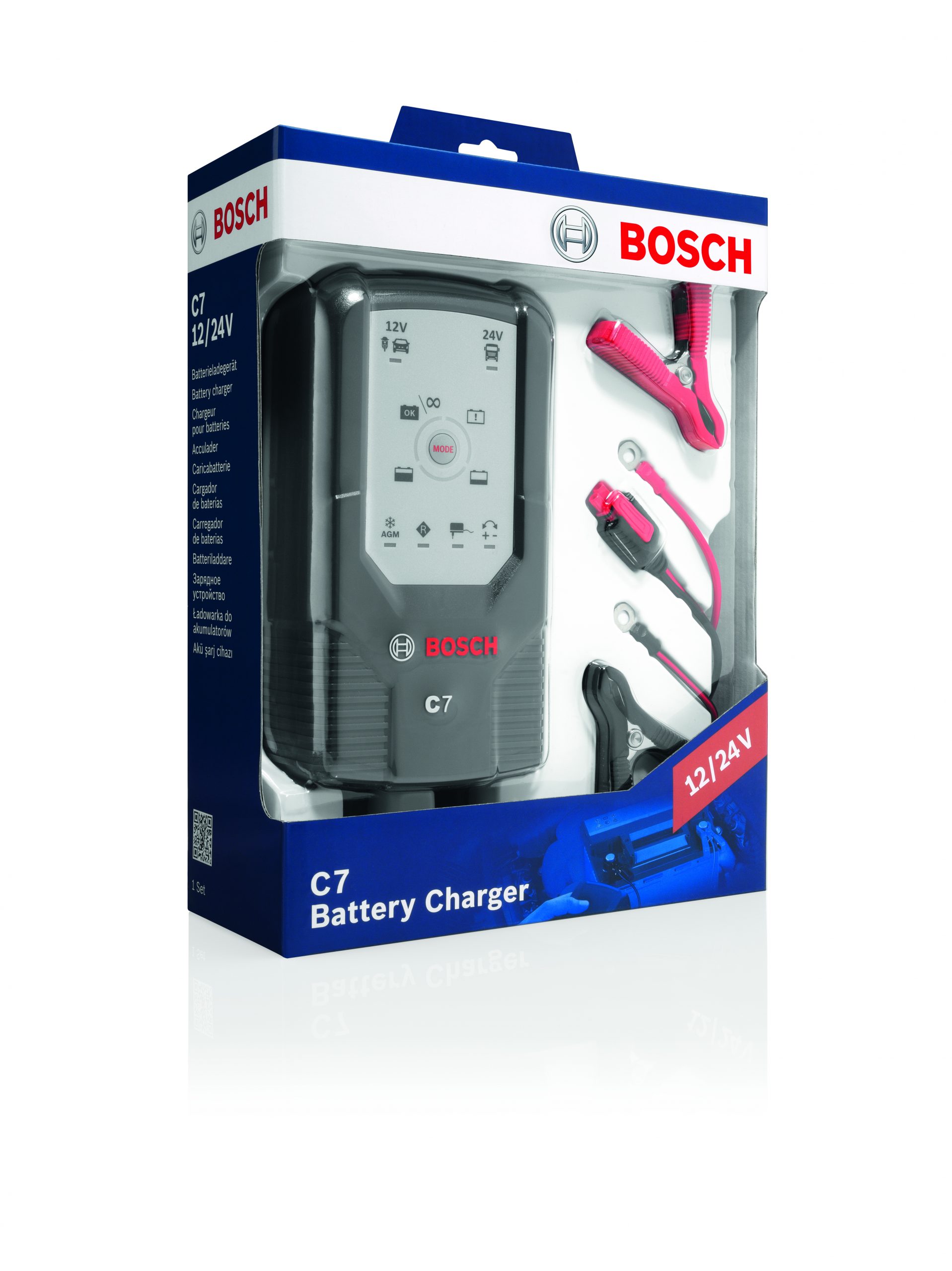 - Bosch C7: 12 & 24 volt battery charger. The Bosch C7 Battery Charger is an intelligent six-stage automatic charger with great extra features including regeneration mode and power backup. Furthermore, the C7 is ideal for charging and maintaining lead acid wet, gel, AGM and VRLA/SLA batteries up to 230Ah (12V) / 120Ah (24V).
