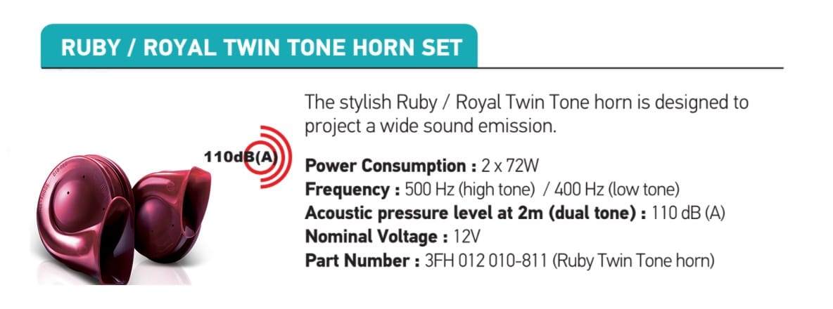 The HELLA Ruby Twin Tone trumpet horn is a light-weight fanfare horn with wide sound propagation. Alongside a stylish clean-line design, these trumpet horns are for the performance oriented driver for whom a high level of safety combined with great design and high quality is key. HELLA horns guarantee best functionality, optimum fit and long lasting customer satisfaction. They are quality horns you can trust from a global leader in automotive technologies for more than 100 years.