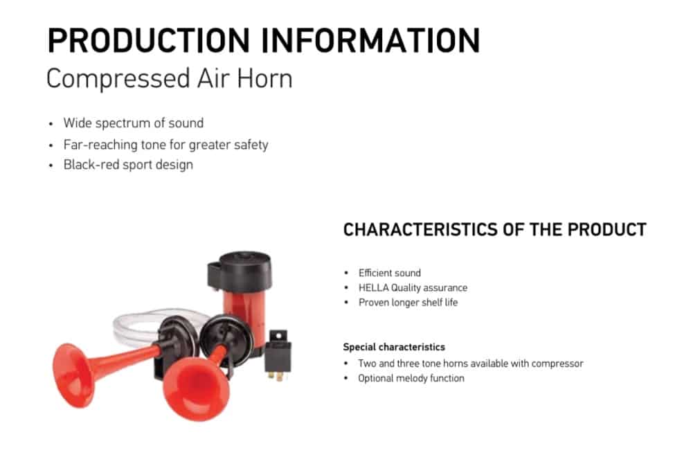 Features: • Wide spectrum of sound for sound efficiency • Far-reaching tone for greater safety • HELLA quality assurance • Proven longer shelf life Options: • Optional Melody function • Two or three horns available with compressor