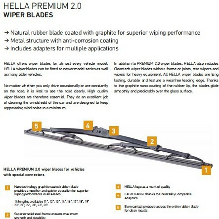 • Hella Wiper Blades are subjected to the highest quality requirements and meet the stringent test standards of Japanese Industrial Standards (JIS) and the Society of Automotive Engineers (SAE).