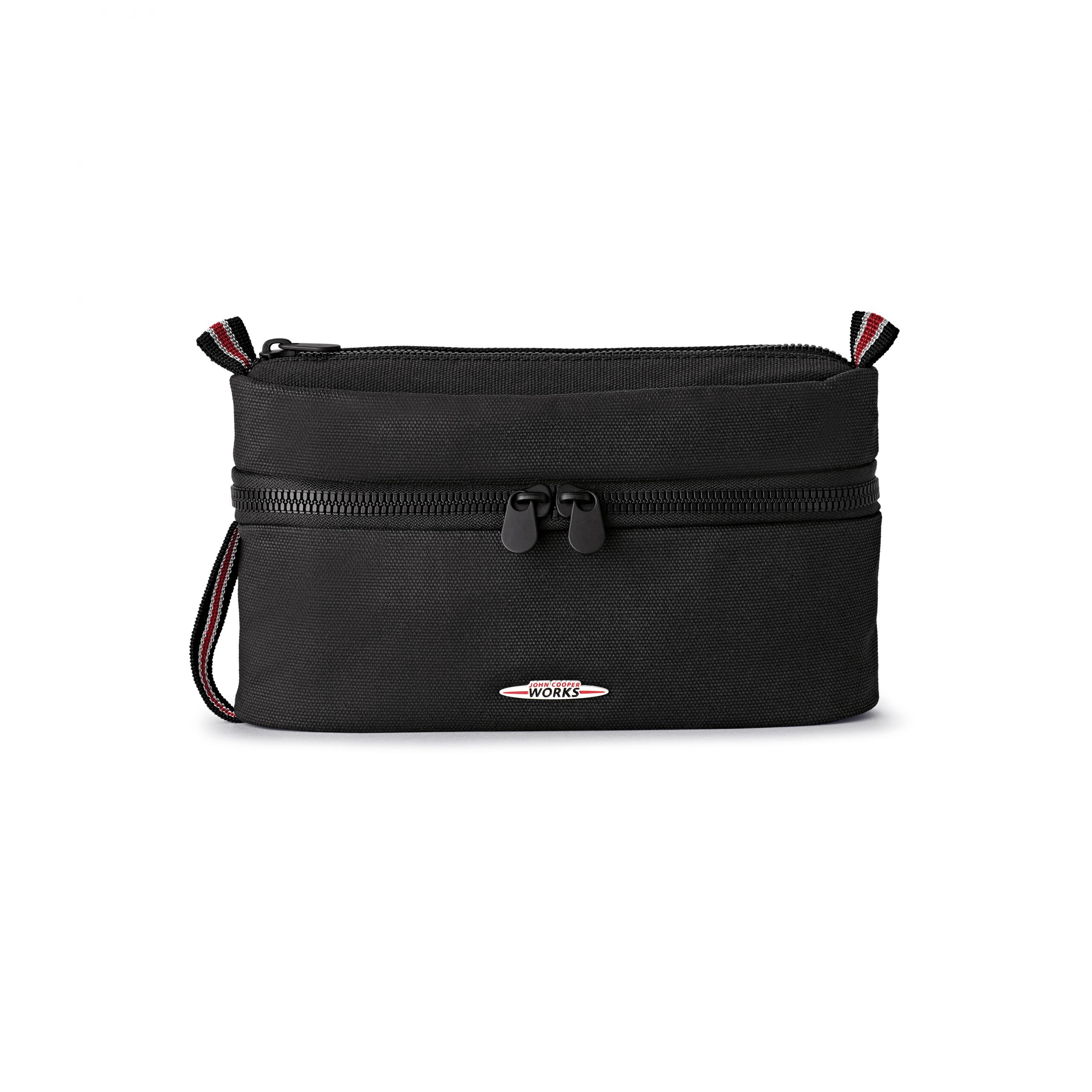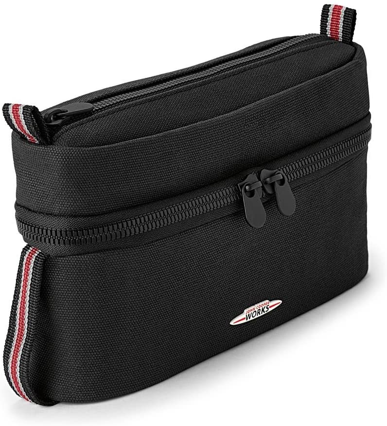 - One large main compartment and an additional smaller top compartment allow for easy storage and organization of all kinds of small items. It has a hand strap for easy transportation, a JCW metal logo on the outside and a MINI Wing Logo leather patch on the inside pocket.