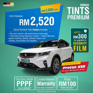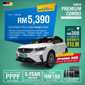 Horus Premium Combo for Proton X50 (Tints + Coating) | Retail Price: RM8,630 | Offer Price: RM5,390 | Booking Fee: RM1,340